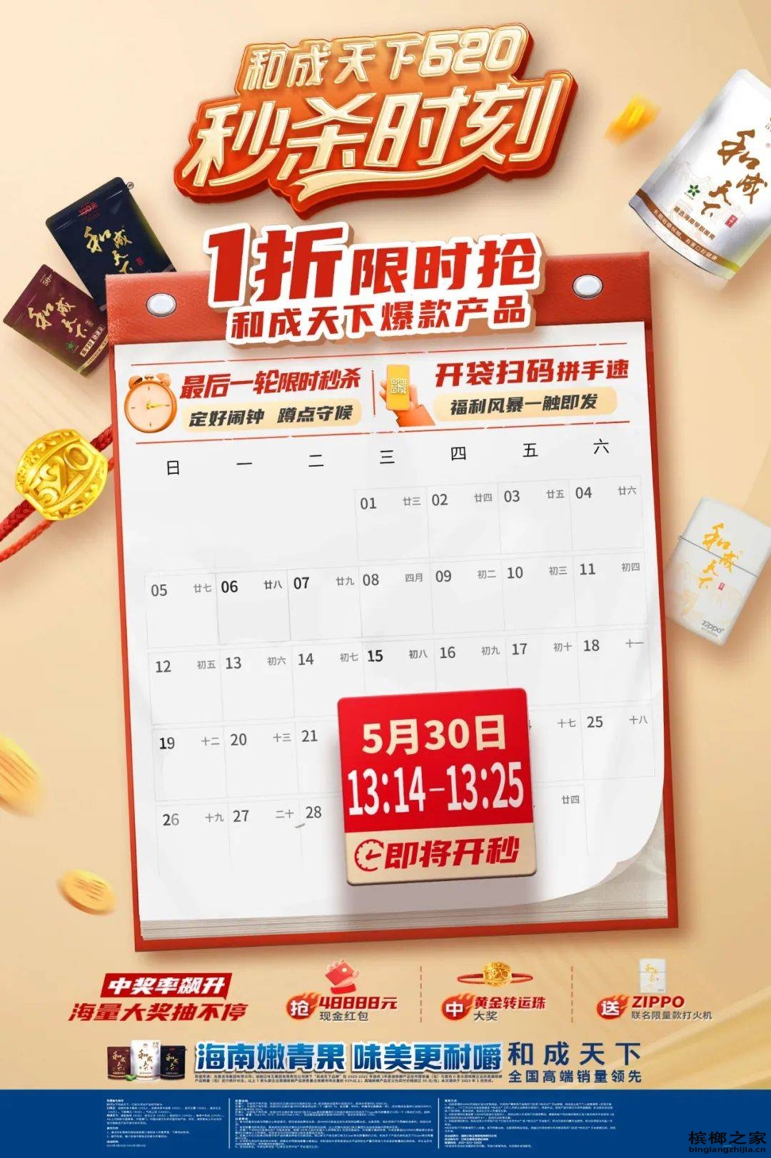 目前,和成天下520狂欢节最后一轮秒杀时刻将在5月30日13点14分开启,开袋扫码拼手速,和成天下爆款产品1折/2折/5折限时抢,中奖率飙升!开袋扫码,抢48888元现金红包、中50000份黄金转运珠大奖、送20万份Zippo联名限量款打火机,赶紧抓住机会,圆梦转运火一把。需要提醒大家的是,活动仅剩不到10天的时间,错过就只能再等一年,粉丝们一定要抓紧了!