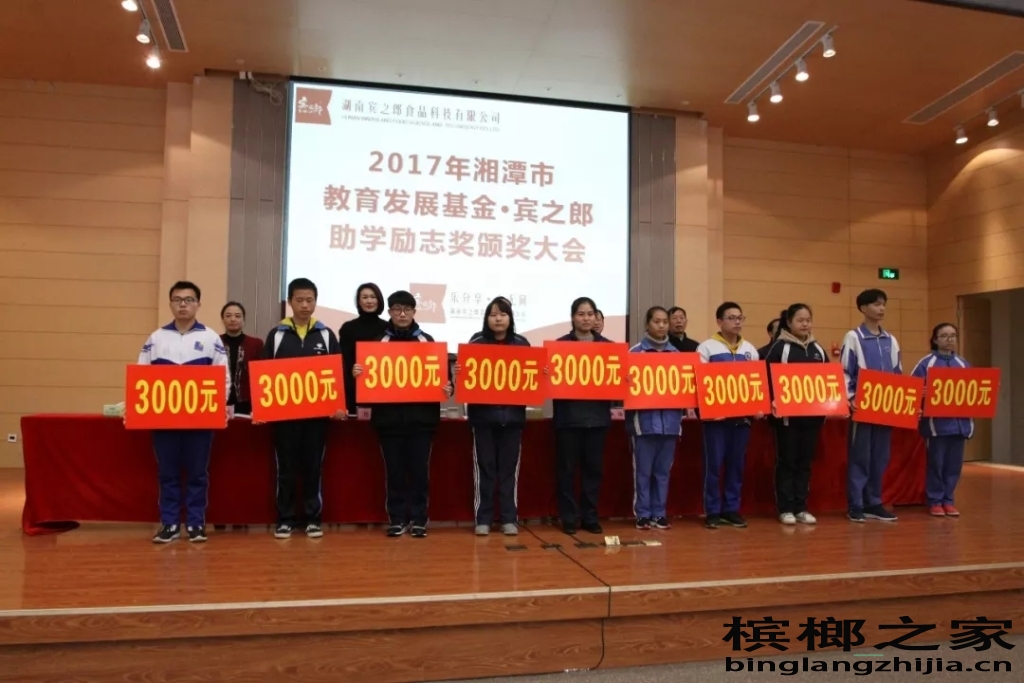 “少年强则中国强“。2014年,湖南宾之郎食品科技有限公司为帮助和鼓励更多的孩子克服家庭困难,通过不断努力学习,用知识改变命运,报效父母、成为国家的有人之才。设立了第一期面向湘潭地区范围内小学、初中、高中学生助学奖励的“宾之郎·助学励志奖”,第一期奖励基金500万,以“以奖代助”的形式“扶贫、扶智和扶志”,扶贫帮困,关注下一代健康成长,授人以渔,为国家和社会培养更多的优秀人才。践行宾之郎“企业发展、员工幸福、社会和谐”的企业价值观,履行当代企业家的神圣社会使命。