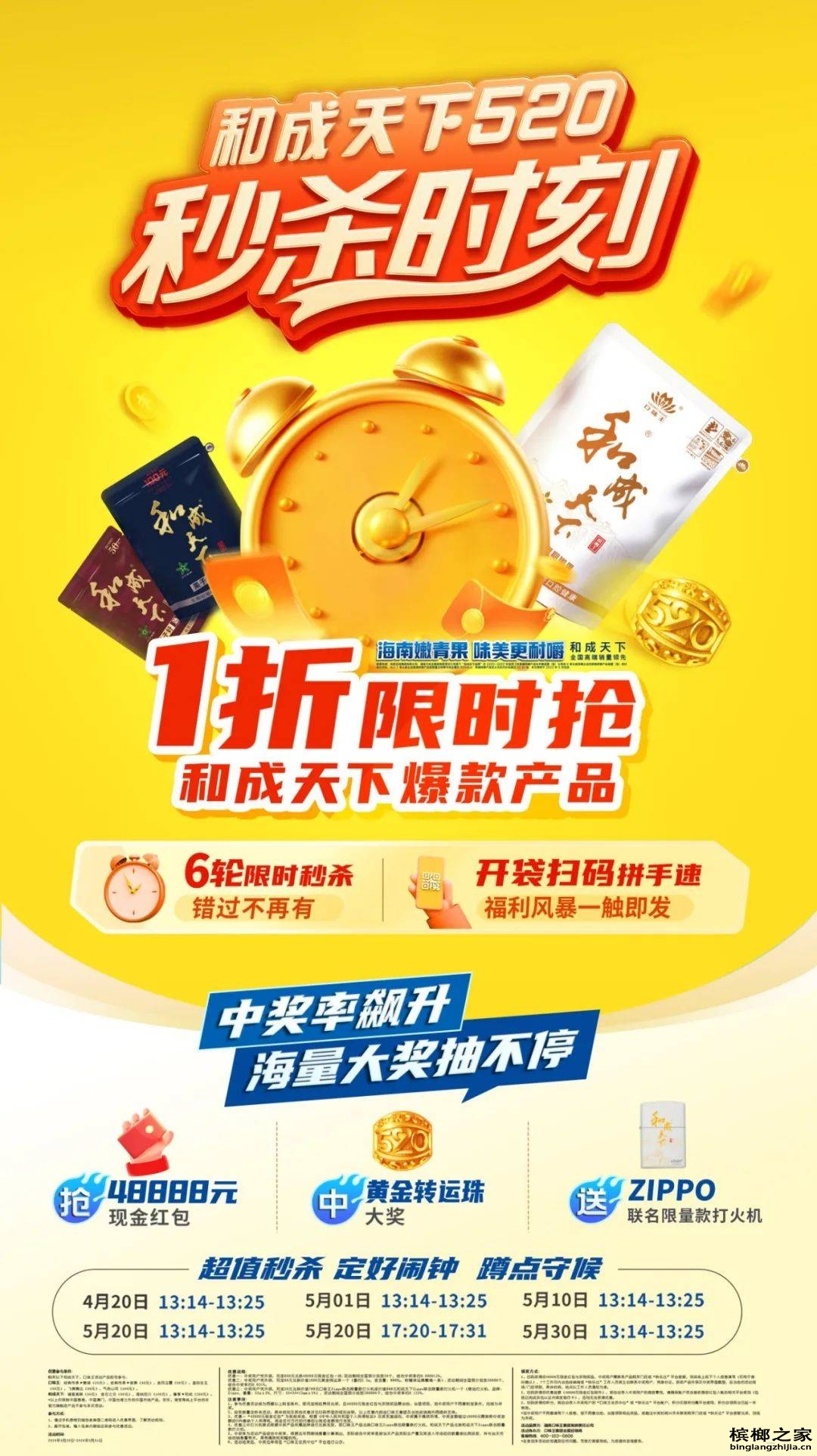 和成天下在追求高端品质和传承千年槟榔文化的同时,也不忘回馈广大消费者的支持和喜爱,连续9年举办和成天下520狂欢节宠粉活动,这一次宠粉福利更是重磅升级,即日起至5月31日,开袋扫码就有机会抢48888元现金红包,中5万份黄金转运珠大奖,送20万份Zippo联名限量款打火机,海量大奖福利狂欢不停!目前已经有很多幸运儿中奖了,还不快快行动起来!